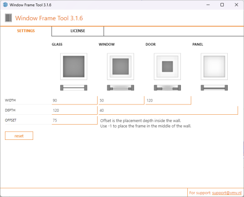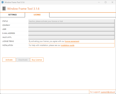 Start de WindowFrameTool door op het settings icoon te klikken. StairUp zal automatisch in het "license" tabblad terecht komen.